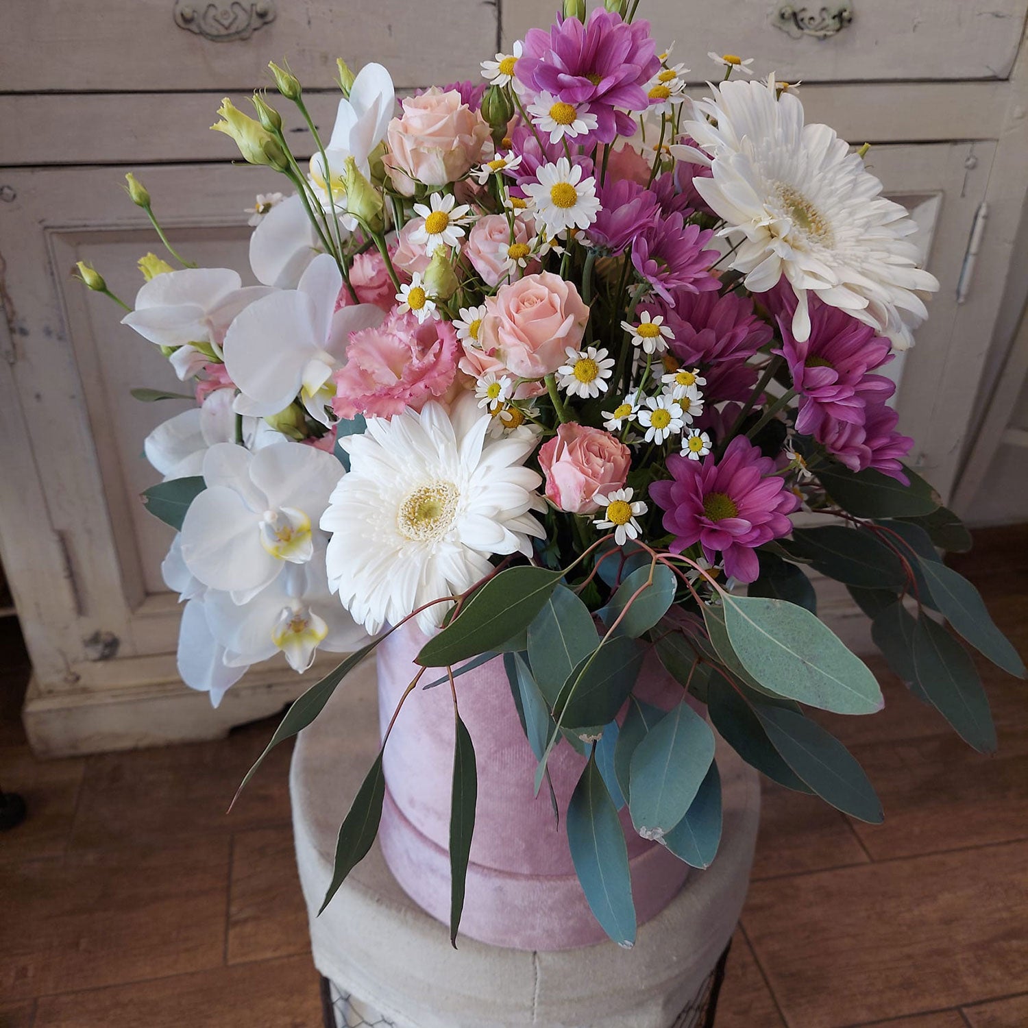 Composizione nella spugna (riserva d 'acqua) di fiori freschi a tema Nascita confezionati in un' elegante scatola (la scatola può essere di cartone di vari colori, rivestita di velluto oppure di yuta, in base alle disponibilità del momento).